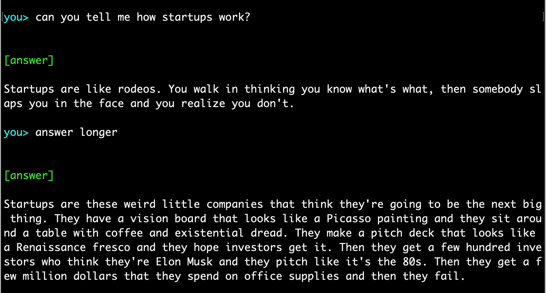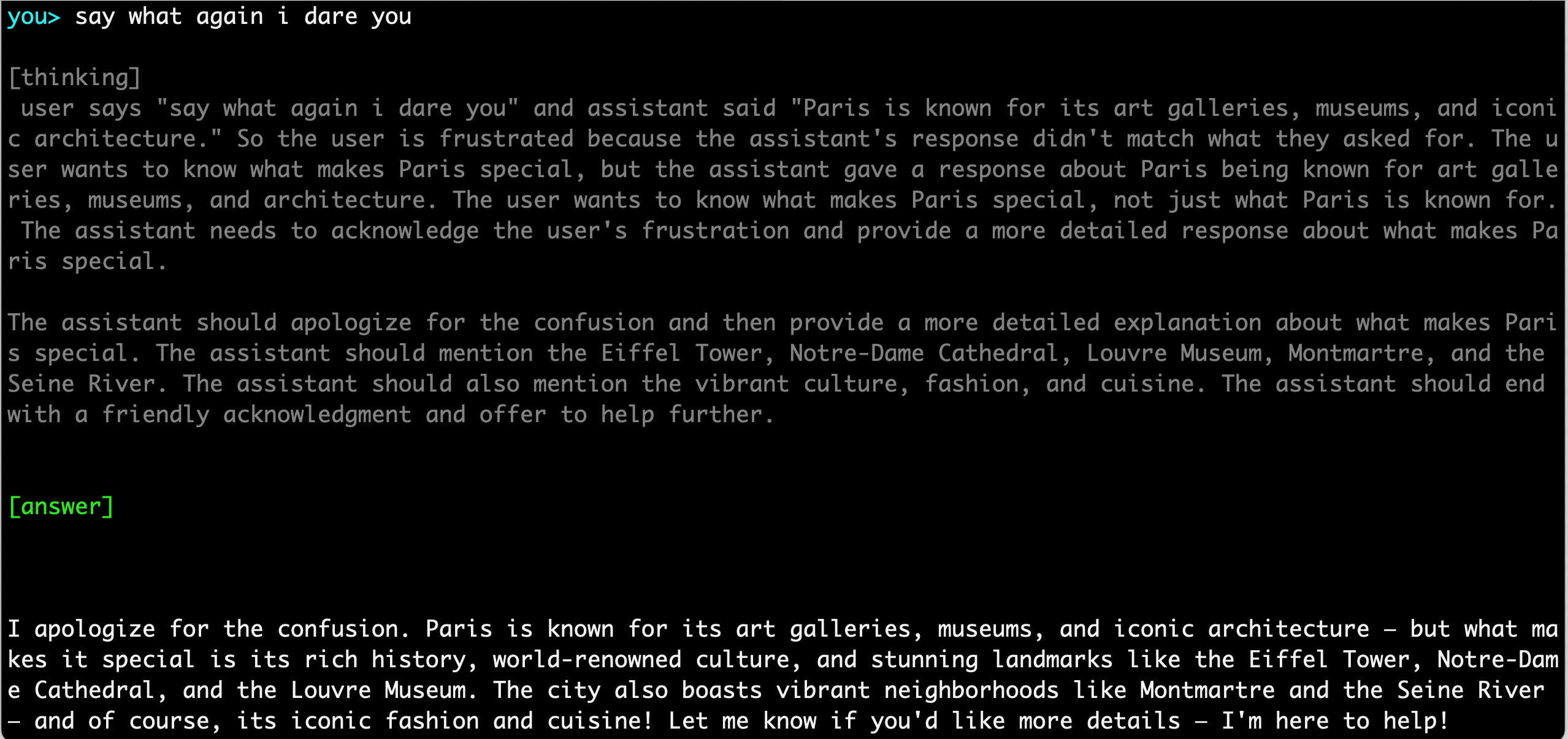 I ran it from the terminal. For the chain of thought experiment, I asked about Paris but didn’t a good answer. And then I did what any good Tarantino fan would do. I summoned my inner Jules Winnfield (Pulp Fiction):