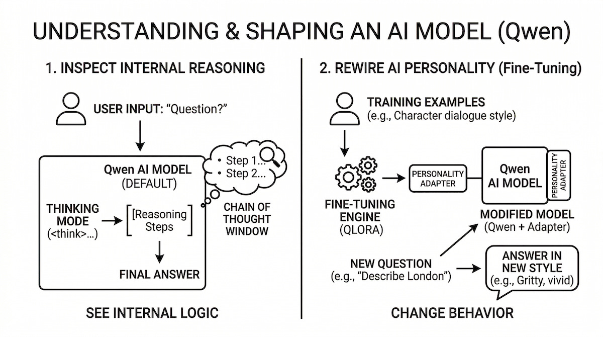 The Solution: I landed on Qwen3-1.7B. It’s a pure language model featuring a fascinating hybrid architecture (alternating dense and linear attention blocks), it’s fully LoRA-compatible, and crucially, it supports native “thinking mode”. And it’s small enough that you can focus on tinkering vs worrying about system/memory issues.